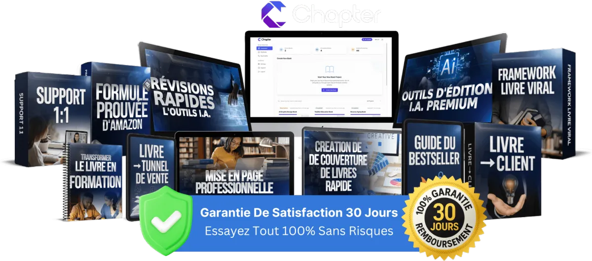 L'Accès Complet au Logiciel Chapter™ + 1 Jeton Livre Gratuit (Valeur : 497 €) Le système A-Z ultime qui vous mène de l'idée au livre publié—sans blocage de l'écrivain, brouillons sans fin, ou frustration. Utilisé par +2000 experts, ce logiciel clé en main crée un livre professionnel qui attire les clients en un temps record et vous positionne comme l'autorité incontestable dans votre niche.